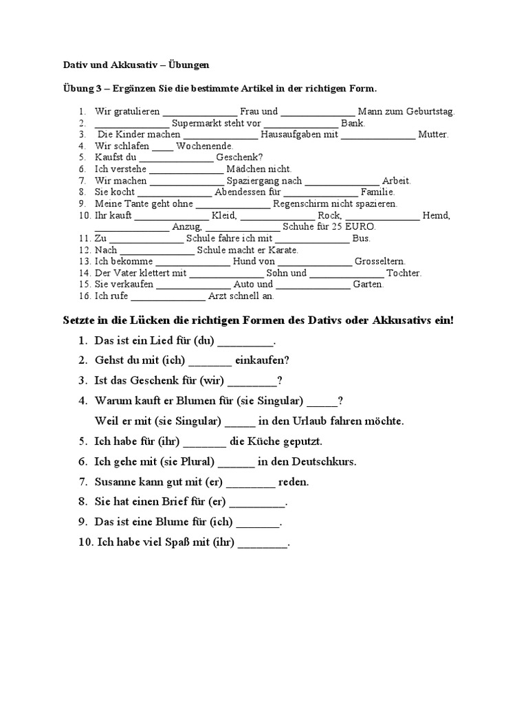Öffnen - Lösungen PDF. Übungen mit lösungen zur Dativ Und Akkusativ. Aufgaben zur Dativ Und Akkusativ. Der Dativ ist ein grammatikalisches Kasus des Deutschen, der unter anderem für die Benennung von Zielpersonen oder Zielobjekten verwendet wird. Beispielsätze mit dem Dativ lauten: „Ich gebe dir das Buch." oder „Wir suchen einen.