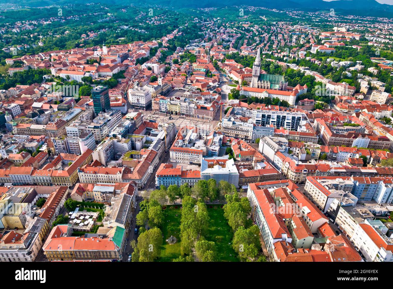 Zagreb Hauptplatz und Kathedrale Luftpanorama, berühmte Wahrzeichen der Hauptstadt von Kroatien